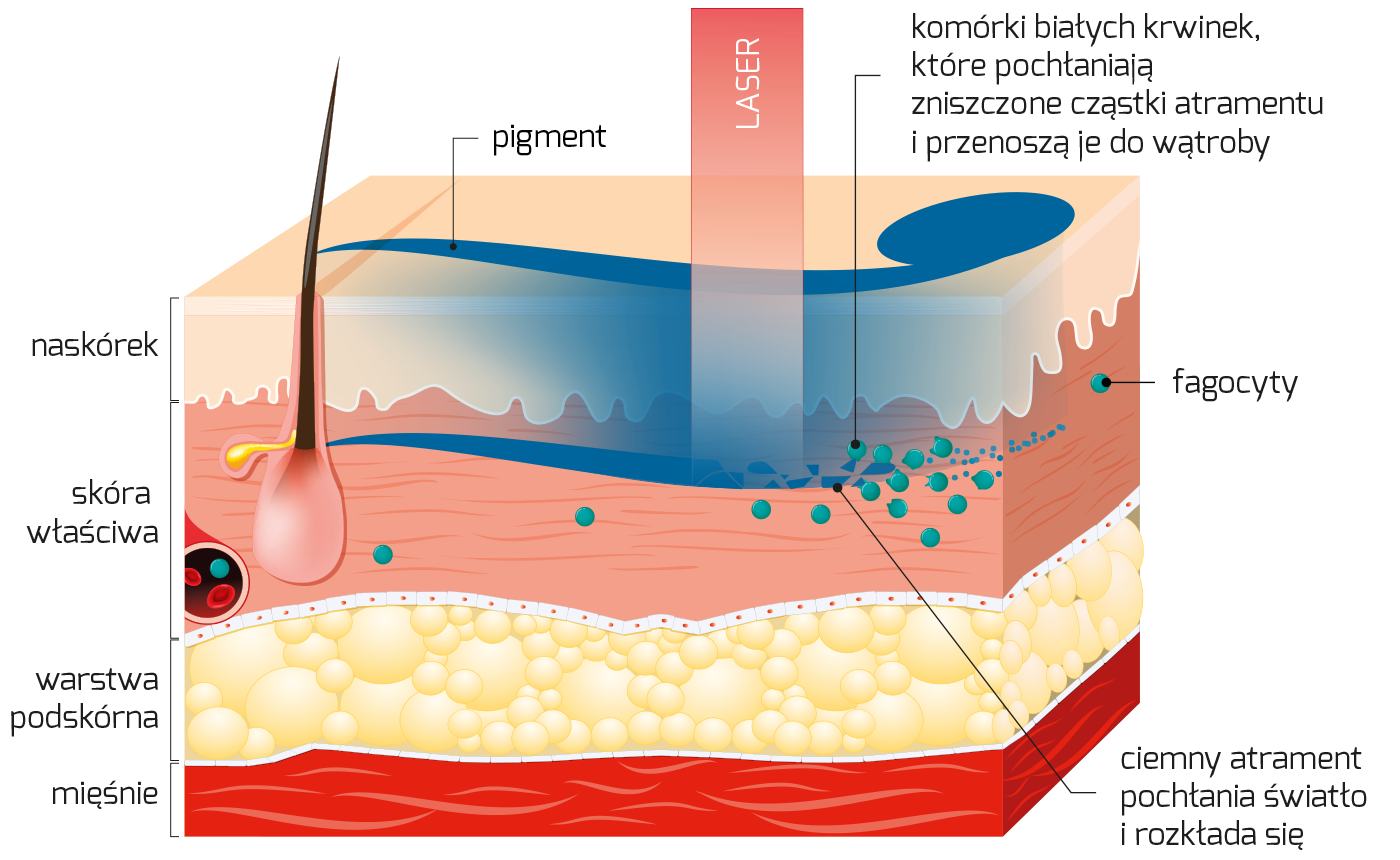 Laser pikosekundowy PICOSKIN, którego używamy w naszych gabinetach, reprezentuje najnowszą generację technologii w usuwaniu tatuaży i makijażu permanentnego. Dzięki zestawowi specjalistycznych głowic oraz różnym długościom fali, urządzenie pozwala na skuteczne usuwanie praktycznie wszystkich odcieni pigmentów, w tym barw najtrudniejszych do rozbicia, takich jak niebieski, zielony czy jasnożółty.
